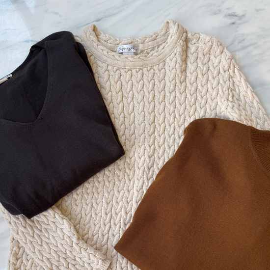 A handpicked edit of sweaters designed for effortless layering. Each piece blends classic tailoring with cozy textures, making it the ultimate knitwear foundation for the season. Can include a variation of the following styles:
