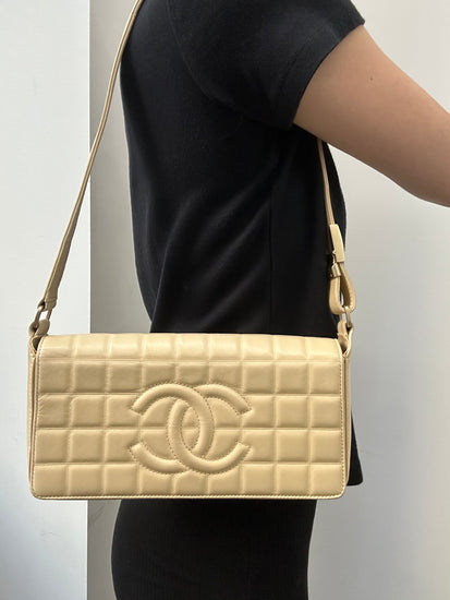Vintage Chanel 2003 Beige Quilted Lambskin Chocolate Bar Flap Bag