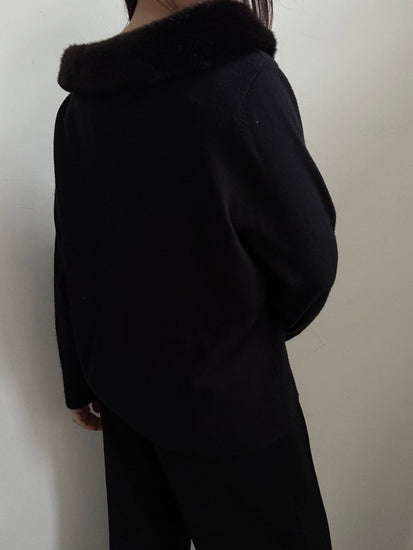 Vintage Black Long Sleeve Top Faux Fur Collar Size Large