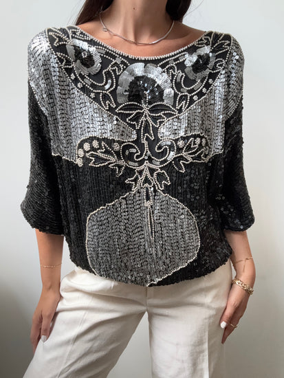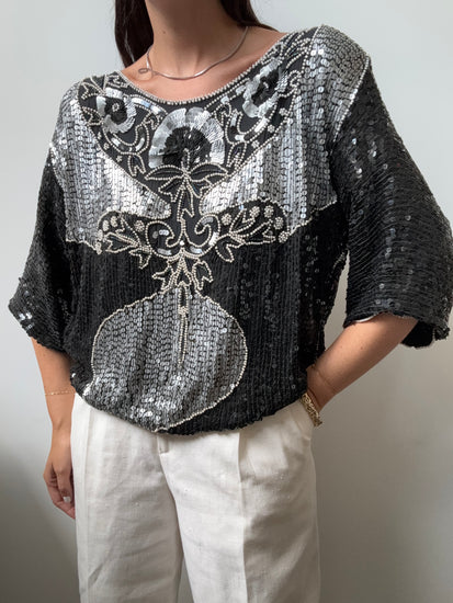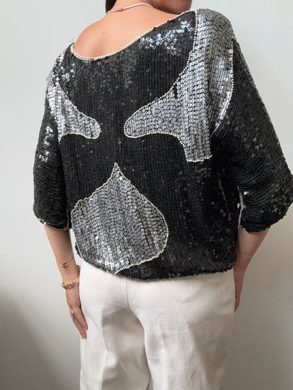VINTAGE BLACK + SILVER SEQUINED TOP
