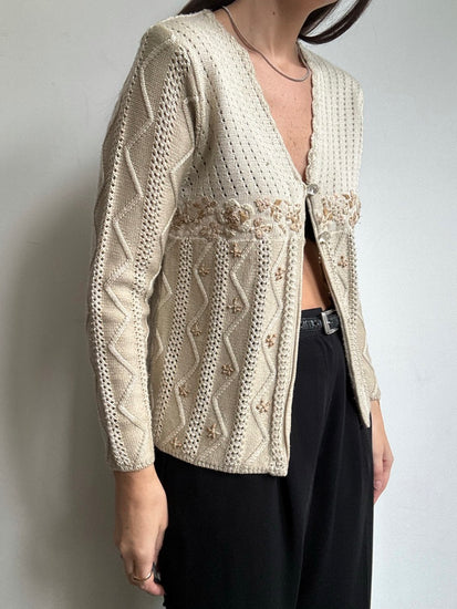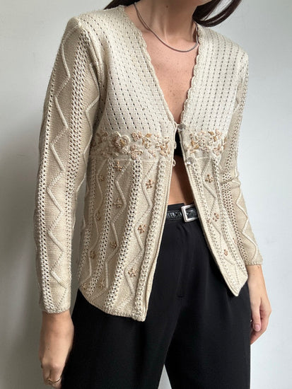 Vintage Beige Crochet + Embroidered Cardigan Size Medium