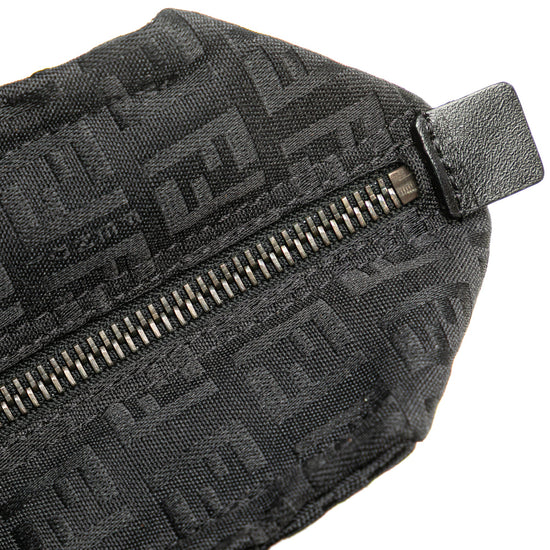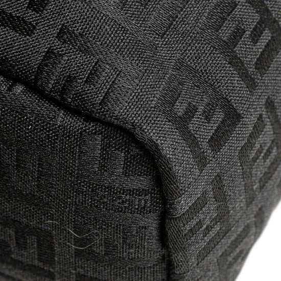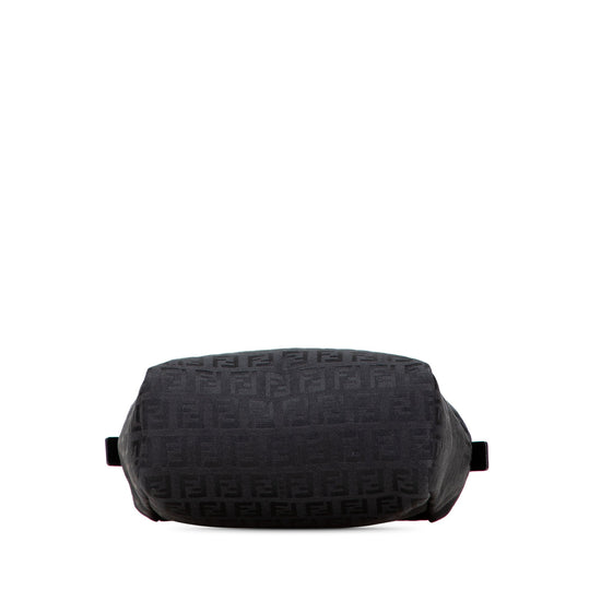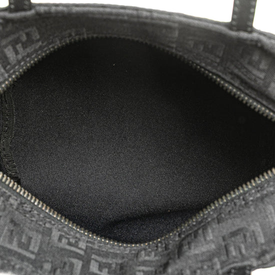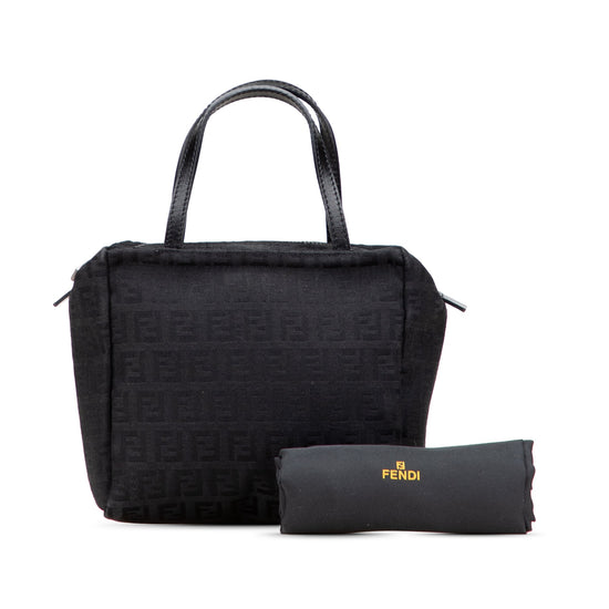 This handbag features a canvas body, flat leather handles, a top zip closure, and an interior slip pocket.