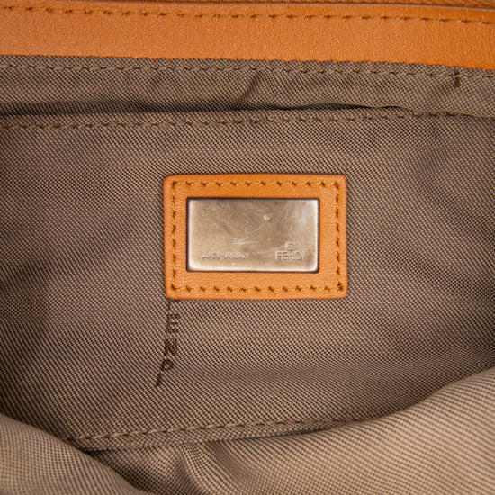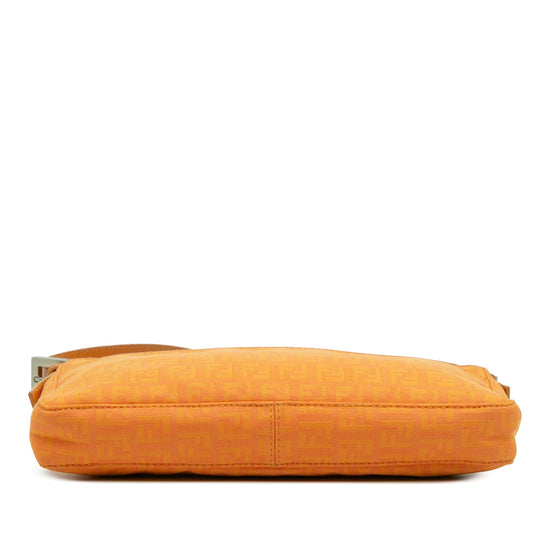 This shoulder bag features a canvas body, a flat leather strap, a top zip closure, an exterior slip pocket, and an interior slip pocket.