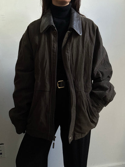 VINTAGE BROWN TWILL BARN JACKET WITH BROWN LEATHER DETAILS